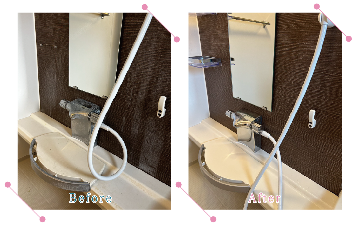 「バスルーム蛇口まわり」の清掃事例です。頑固な汚れを美しく!